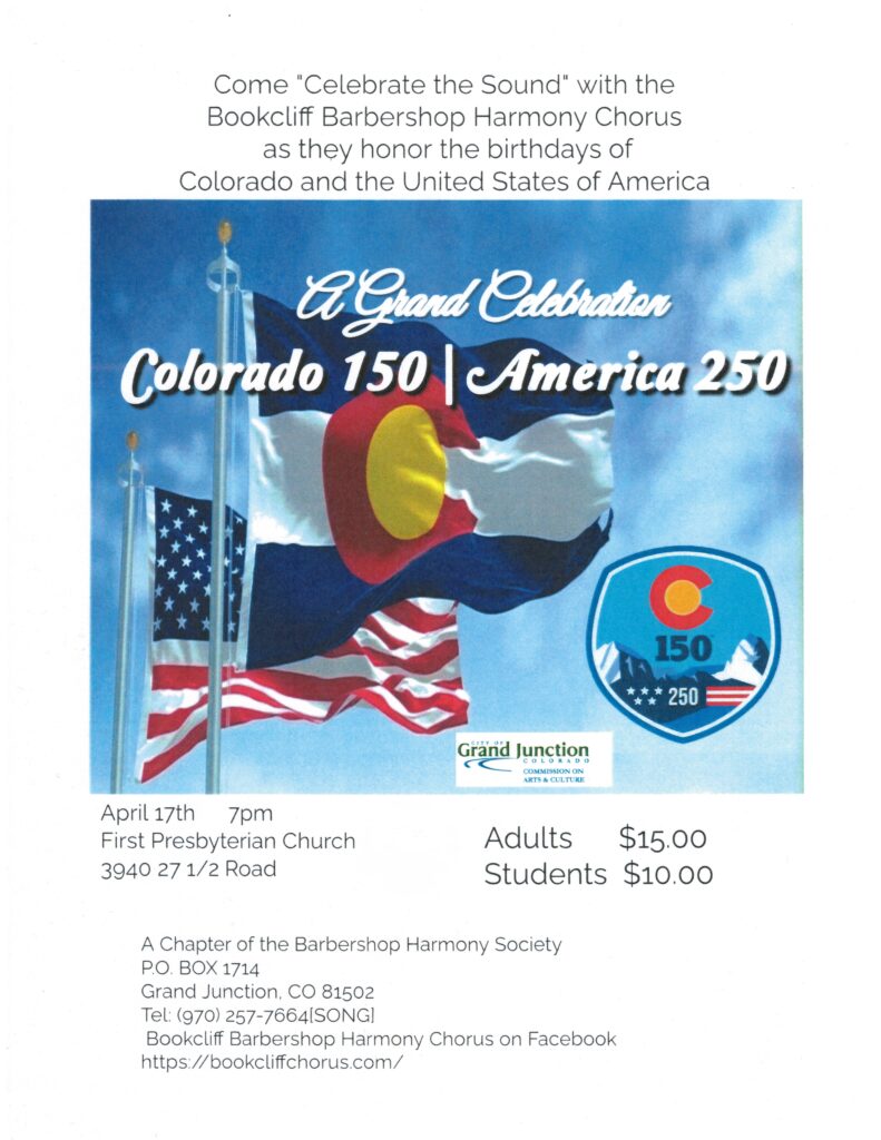 Join us! Find out how much fun it is singing popular songs in four part unaccompanied harmony. We are men of all ages, from all walks of life, who love to sing — we are fans and friends who thrill to the sound of harmony. You don’t have to know anything about music or singing – you just have to want to sing! We practice every Tuesday night at First Baptist Church in Grand Junction (720 Grand Avenue). Call (970)-257-SONG (7664) or email info@bookcliffchorus.com for more information. Learn More